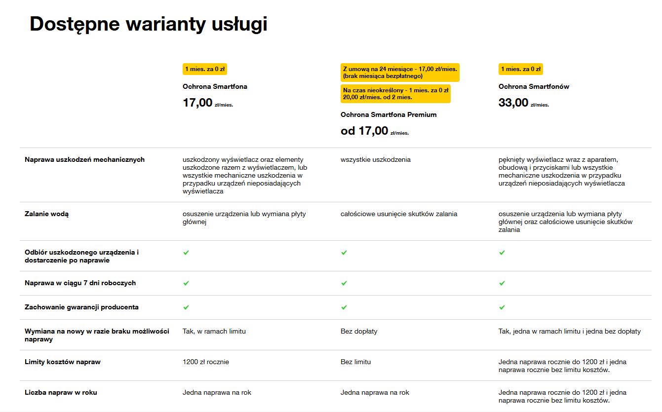 Plus nie oferuje ubezpieczenia w formie polisy ubezpieczeniowej, ale gdyby miało miejsce uszkodzenie urządzenia, naprawią Ci je raz w roku bezpłatnie, jak sama firma podaje: „Nie zadając zbędnych pytań”.